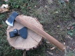 Благодарение на колега от друг форум, любимата ми стара руска брадвичка с феноменалната цена от 3,59 рубли, вече има ецвано острие и нова дрешка. Фала на такъви колиги, както се казва...