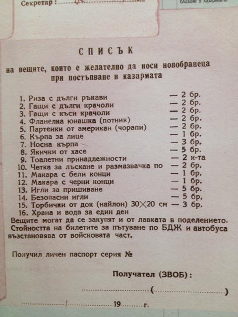 Това е пълния списък на съдържанието на мешката до 1989г. След това не знам как е било. Всичко в списъка отбелязано с "2бр" в мешката е по един. Втория брой се ползваше стационарно в казармата. В повиквателната не е отбелязано, но комплектите тоалетни принадлежности се държаха в дървени кутии изработени от много леко дърво. Всичко това е 2кг багаж. Плюс  плащпалатката, скатката с шинела, внимателно подбраните необходими неща в джобовете, шанцов инструмент и манерка за вода на кръста, канче за храна и лъжица в сухарката и дрехите ни на гърба. Това беше всичко и ни стигаше за много дни и всички походни ситуации.
